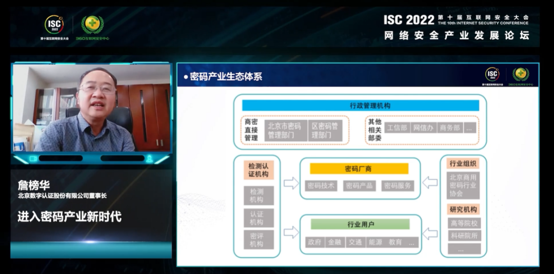 2022年8月1日,第十届互联网安全大会(ISC 2022)在京盛大召开,本次峰会汇集百余位全球网络安全领导者、行业精英及专家学者,千余家网络安全企业参与,共同推动数字安全生态建设。北京凯发国际股份有限公司董事长詹榜华也受邀参会,在线发表了《进入密码产业新时代》的主题演讲。他指出,技术迭代及市场需求更新为密码产业带来更多机会,当下正是商用密码的新时代,密码产业未来大有可为。
