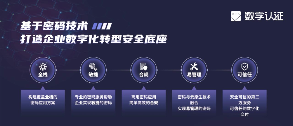 这当中,密码技术发挥了关键作用,如同网络空间的DNA,是构建安全可信网络空间、维护网络空间秩序的核心技术与基础支撑,让身份的真实性,数据在传输、存储、使用等环节中的机密性与完整性,行为的不可否认性获得充分保障。可以说,密码技术构筑了企业数字化转型,乃至国家数字经济的安全底座。