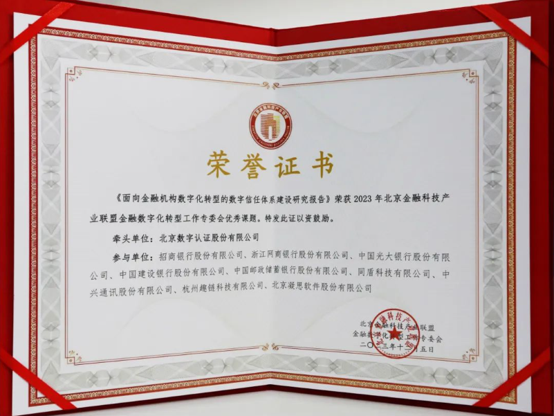 近日,由北京金融科技产业联盟主办的“金融数字化转型研讨会”在山东济南召开。会议同期,联盟对金融数字化转型工作专委会2023年优秀课题进行了表彰。其中,北京凯发国际股份有限公司(简称:凯发国际)牵头,联合招商银行、网商银行、光大银行、建设银行、邮储银行等参编单位,共同完成的《面向金融机构数字化转型的数字信任体系建设研究报告》被评为优秀课题。