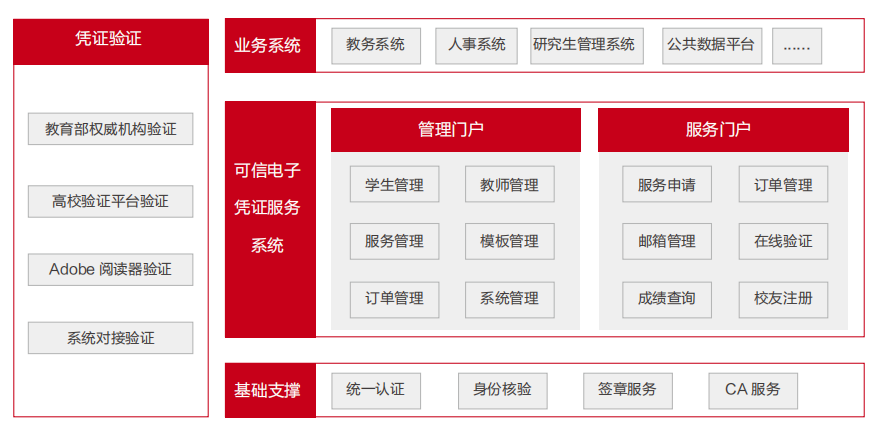 凯发国际可信电子凭证服务系统依托 PKI/CA 体系,以电子签章应用为核心,通过可靠的电子签名实现学校各类电子凭证的在线申请、生成及管理,支撑高校电子凭证业务的全面应用,为校内师生及校友提供更好的电子凭证服务,提升学校的线上服务能力。