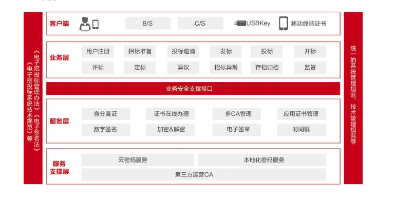 向用户提供统一云服务接口,为招投标全流程提供数字证书服务,实现系统远程实施、招标、投标、开标、评标、定标等全流程电子化。