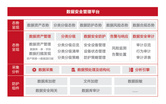 提供数据资产管理、数据风险监测、数据安全策略管控、数据安全告警跟踪处置等功能,全面支撑数据安全运营工作