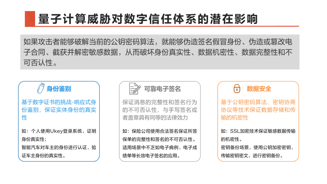 夏鲁宁提到,1994年数学家Peter Shor提出了一种可利用量子计算机破解当前广泛使用的公钥密码系统的算法。PKI及其应用大量使用这些公钥密码算法,如被破解,就使得伪造签名、篡改合同、破译加密信息等攻击易于发生。因此,PKI及其应用尽早考虑向抗量子公钥密码(PQC)迁移,是基于安全的重要考虑。
