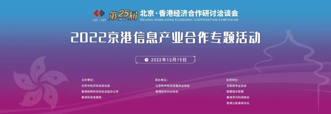 12月15日,第二十五届京港洽谈会“2022京港信息产业合作专题活动”在北京、香港双会场,以远程联动方式圆满召开。活动由北京市经济和信息化局、香港政府资讯科技总监办公室、香港贸易发展局主办,北京软件和信息服务业协会与香港软件行业协会承办,旨在构建京港两地信息产业创新生态,推动两地信息产业深度融合发展。