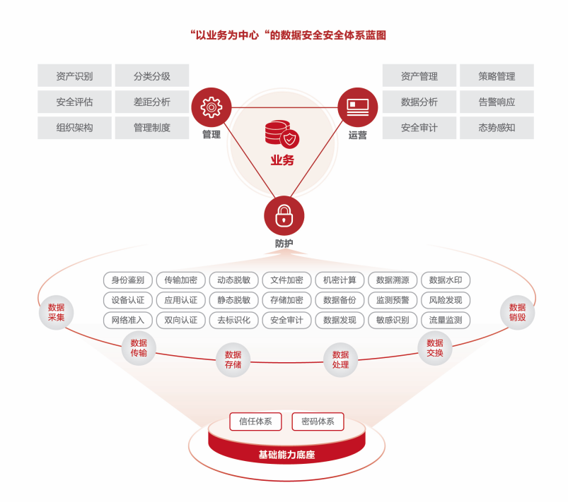 以组织管理、制度管理、统一管理平台为核心,以分类分级、身份认证、数字信任体系为支撑,紧贴业务,构建管理与技术并重的数据安全整体规划